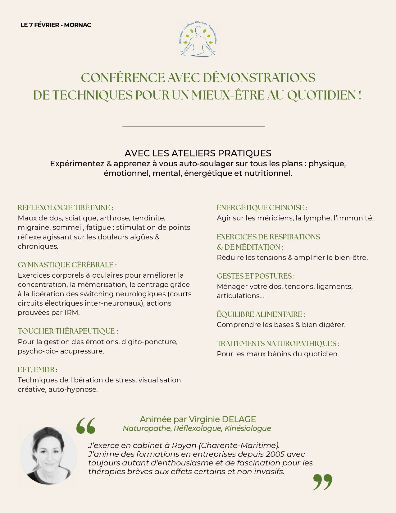 7 février 2026 de 17h30 à 16h30 “Devenez artisan de votre bien-être”. Virginie Delage: Naturopathe, kinésiologue, réflexologue